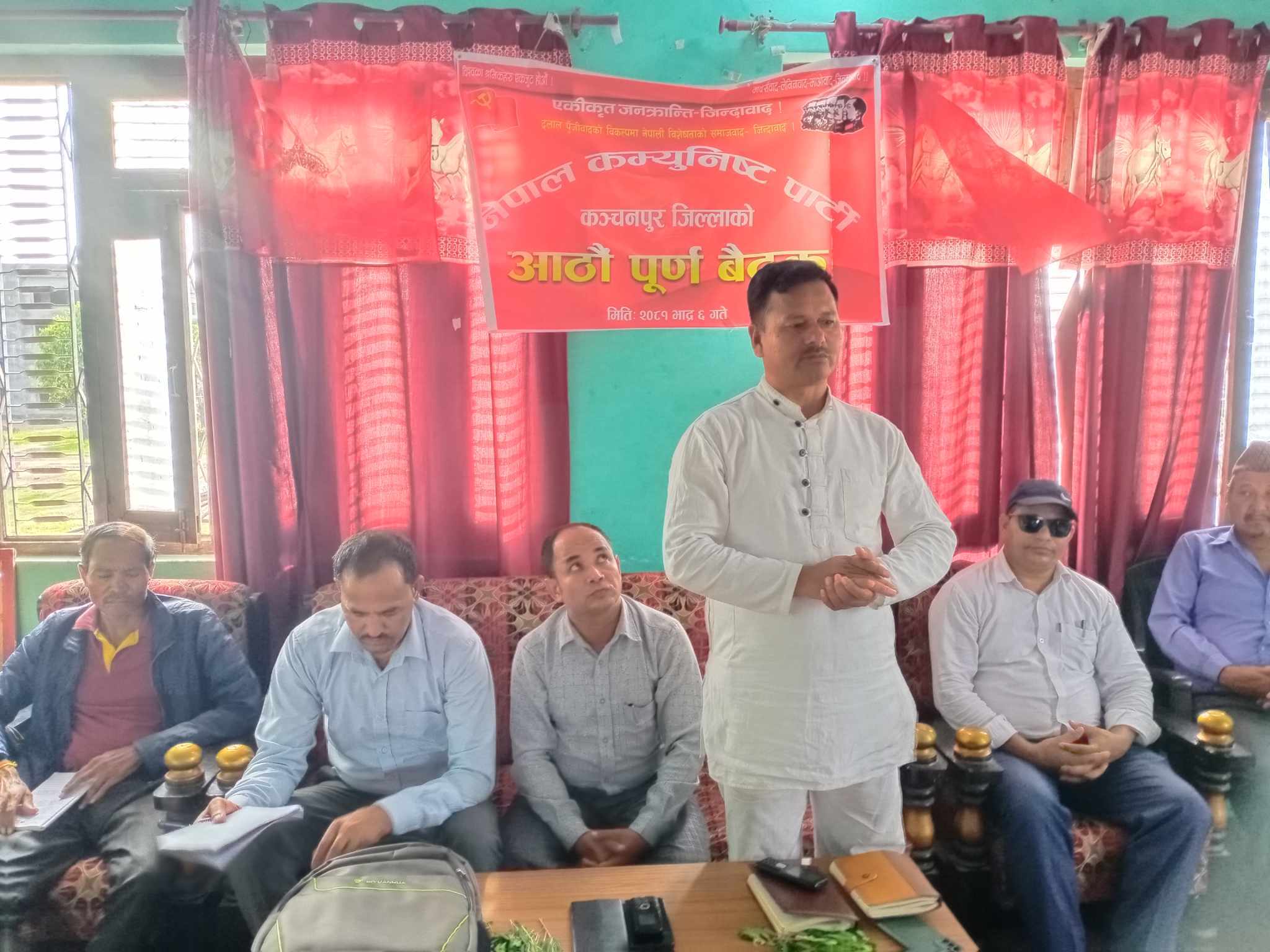 नेपाल कम्युनिष्ट पार्टी कञ्चनपुर जिल्ला समितिको आठौ पूर्ण बैठक सम्पन्न भएको छ। जिल्ला सेक्रेटरी दिवार सीको अध्यक्षतामा सम्पन्न बैठकमा प्रमुख अतिथि नेपाल कम्युनिष्ट पार्टीका स्थायी समिति सदस्य तथा सुदूरपश्चिम प्रदेश इन्चार्ज भरत सी रहेका थिए भने अन्य अतिथिहरूमा पार्टी केन्द्रीय सदस्य तथा प्रदेश कार्यालय सचीव समर सी, कञ्चनपुर जिल्ला इन्चार्ज विराट सीलगायत रहेका थिए।