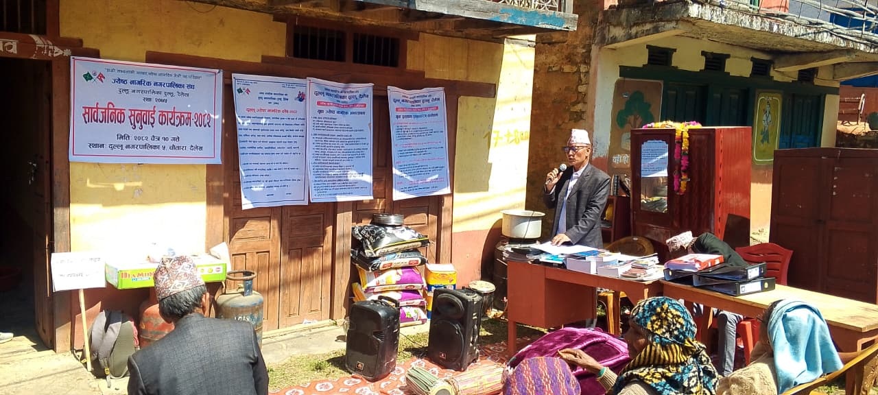 केशवराज पौडेल । जेष्ठ नागरिक दुल्लू नगरपालिका संघले आज एक कार्यक्रमको आयोजना गरि सार्वजनिक सुनुवाई सम्पन्न गरेको छ। दुल्लू नगरपालिका पाँच चौतारा स्थित आफ्नो अस्थायी कार्यालयको प्राङगणमा कार्यक्रम भएको हो । उपस्थिित सबैभन्दा जेष्ठ टिकाराम थापाको अध्यक्ष्यतामा भएको हो ।